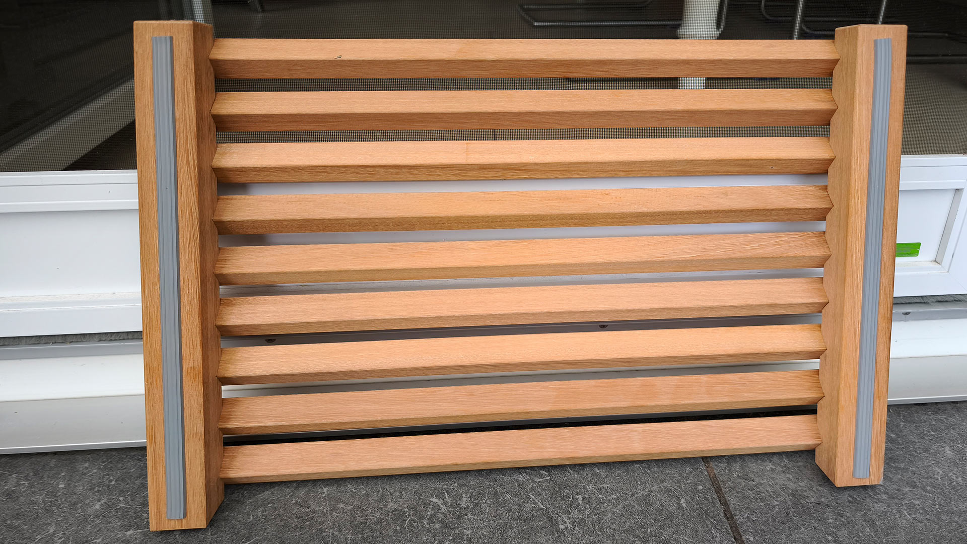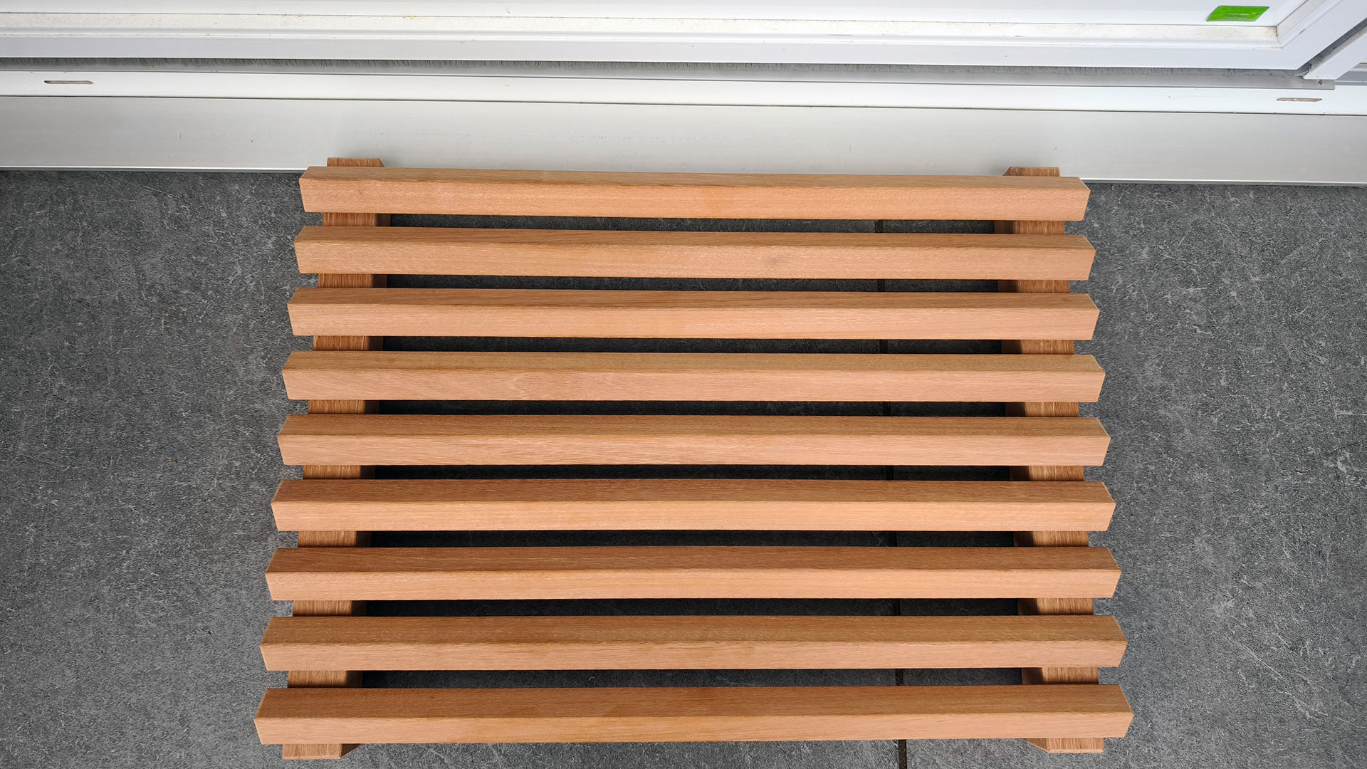 Die Trittleisten dieses stabilen Schuhrosts sind lediglich leicht abgerundet zugearbeitet, sodass den Sohlen anhaftenden Erdresten sowie Steinchen, Matsch oder Schnee praktischerweise darin verfangen. Diese Konstruktion ist wasserfest verleimt und zusätzlich mit verdeckten Edelstahlschrauben miteinander verbunden, sodass diese Holzkonstruktion aus massiven, nässebeständigen Bangkirai Holz dauerhaft haltbar ist. Das unbehandelte Material wird allerdings mit den Jahren naturgemäß vergrauen.