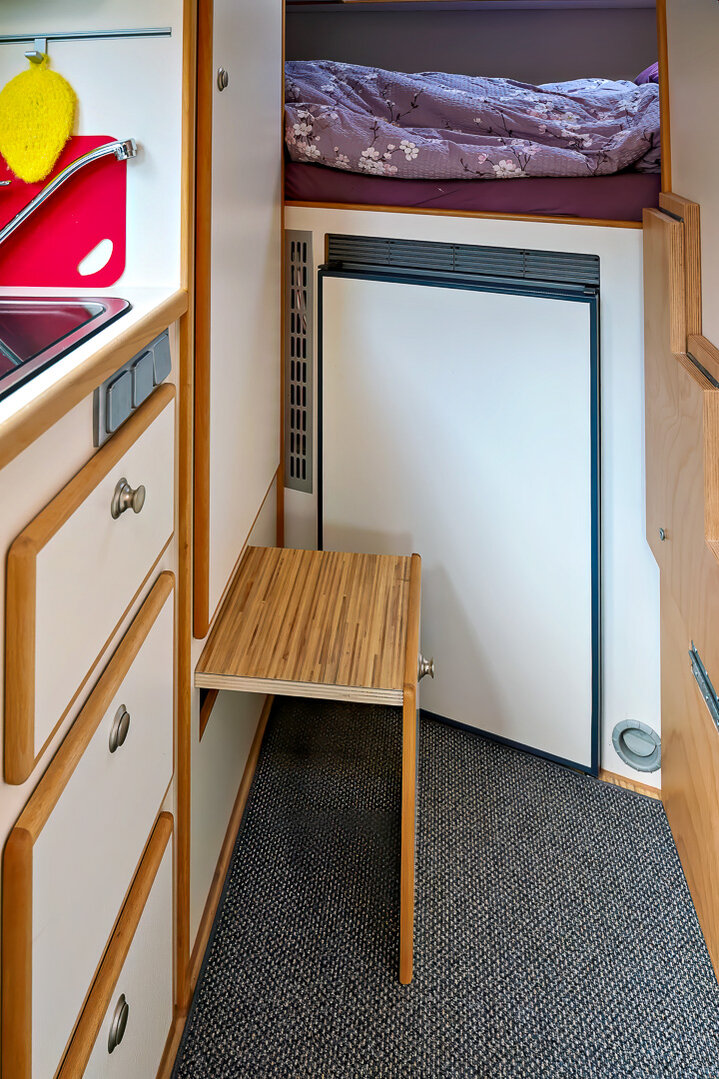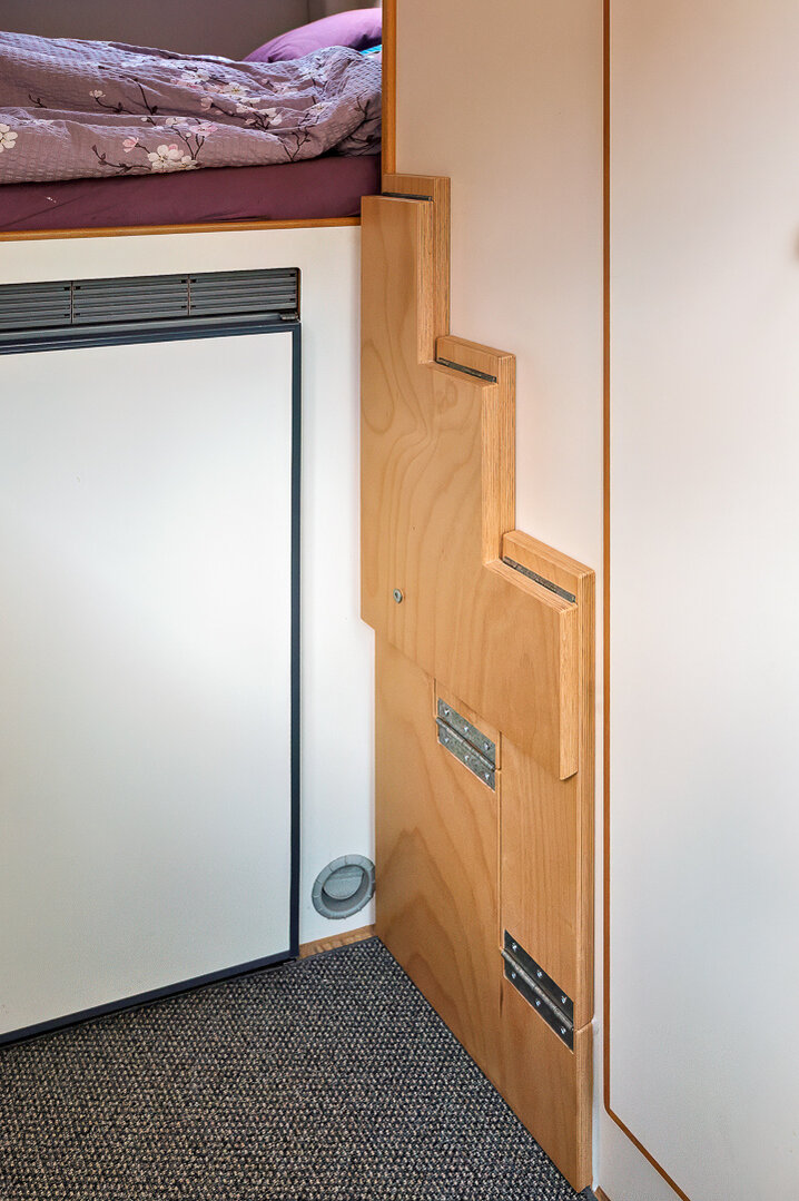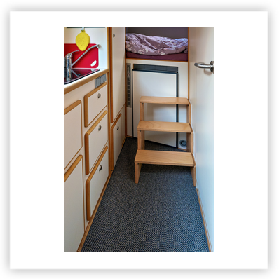 Sicherlich kennt das so mancher Camper nur zu gut, es muss immer möglichst alles auf engsten Raum perfekt passen. Dennoch bleibt einiges nur umständlich oder gar schwer erreichbar und es muss folglich ein individuelle Lösung her. Hier kommt als Beispiel die individuelle gefertigte "Klappbare Einstiegshilfe" aus dem Hause Schepers zum Einsatz. In unserem Musterbeispiel -siehe Bilder-, lässt sich sehr gut der Vergleich zu einer Standardversion erkennen. Um hier das hochlegende Bett zu erreichen ist in der Standardversion gerade mal eine ausziehbare jedoch viel zu niedrige Fußbank vorhanden, die somit einfach nur unpraktisch ist. Es erfordert zumindest eine gewisse sportlich Fitness, um hier das Bett bequem erreichen zu können. Anders dagegen ist unsere speziell gefertigte Schepers "Klappbare Einstieghilfe" mit 3 Stufen, die nahezu unsichtbar sprich sehr flach an der Wand montiert wurde und bei Bedarf einfach nur ausgeklappt werden muss.